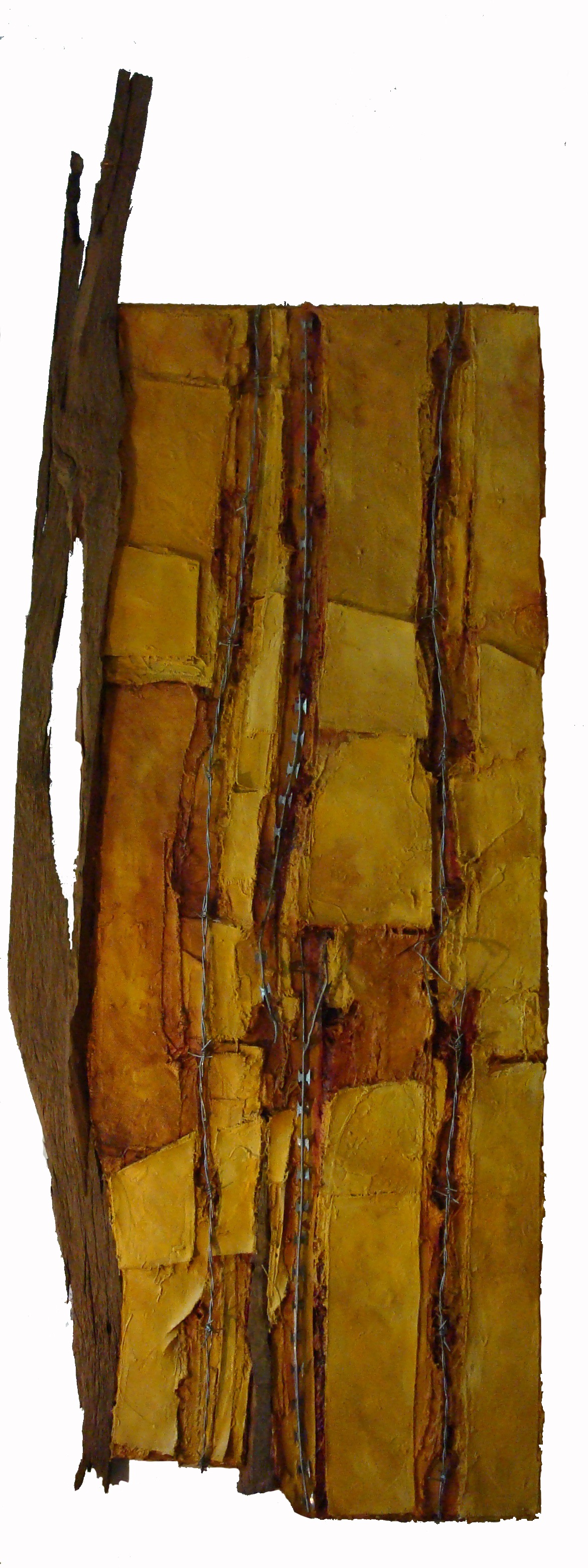 What was of immediate interest was that in the way the veneer and wound from before had become torn surface/land, the representation of the wound had become a literal gash, so too had the representation of land, become actual soil. There were many who found a link between the barbed wire and the extremely violent assault that my family and I endured at that time. In my mind this link was not written, but the related idea of defining and identifying territories as well as the land as object (manipulated in the extreme, as had occurred in this country for over 100 years) began to emerge.