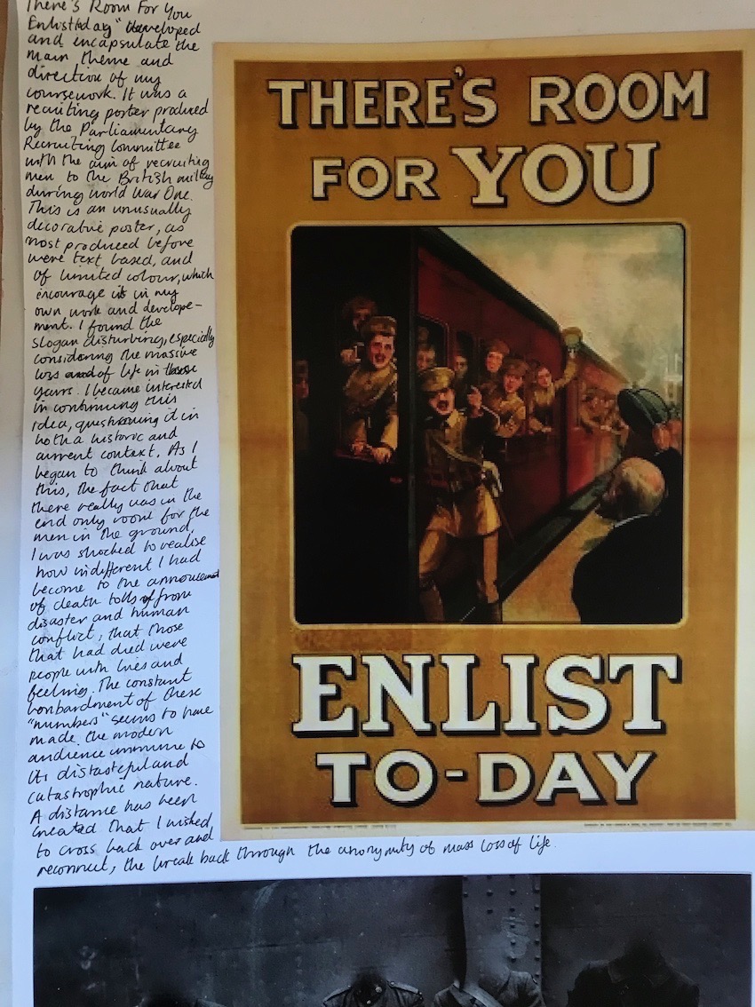 “There’s Room For You – Enlist Today” developed and encapsulates the main them and direction of my coursework. It was a poster produced by the Parliamentary Recruiting Committee with the aim of recruiting men to the British Military during World War One. This is an unusually decorative poster, most produced before were text based, and of limited colour… . I found the slogan disturbing, especially considering the massive loss of life in those years. I became interested in continuing this idea, questioning it in both a historic and current context. As I began to think about this, the fact that there really was in the end only room for men in the ground, I was shocked to realise how indifferent I had become to the [announcement?] of death tolls from disaster and human conflict, that those that had died were people with lives and feeling. The constant bombardment of these “numbers” seems have made the modern audience immune to its distasteful and catastrophic nature. A distance has been created that I wished to cross back over and reconnect, the break back through the anonymity of mass loss of life.” (IR, Coursework Supporting Work Page 4).