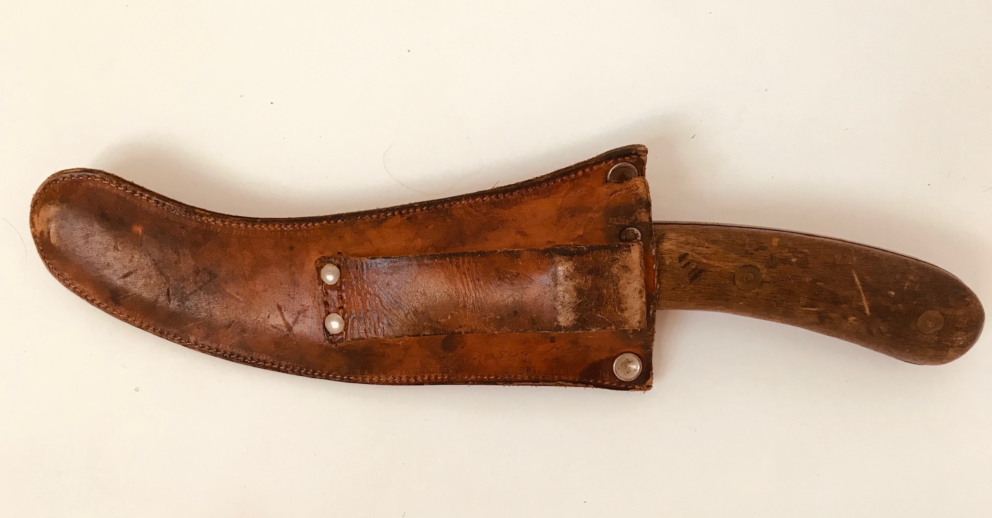 I have a specialist knife that belonged to my father. It is a sort of flattened “S” shape, with a handle at one end and the blade on the inside curve of the other, like a sickle. It has no sharp point, just a rounded, curved, protected end. It is held by a broad, curved sheath with no clips, so that it can be quickly and easily used.