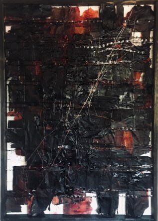 I have chosen to respond significantly larger than the original work, endeavouring to evoke a similar sense of unrest and distress, I hope to have achieved a sense of the immense struggle of Rembrandt. There is little reference to the figurative details of the composition, rather, a consideration of the structure in an attempt to retain the sense of chaos. The materials I employ are those I have been using in recent months. They speak to the matrix that surrounds us; that of control and fragility. This work aims to reflect the great forces at play in our own context. Those forces aiming to wrestle the chaos, the darkness, the despair, into some state of order.