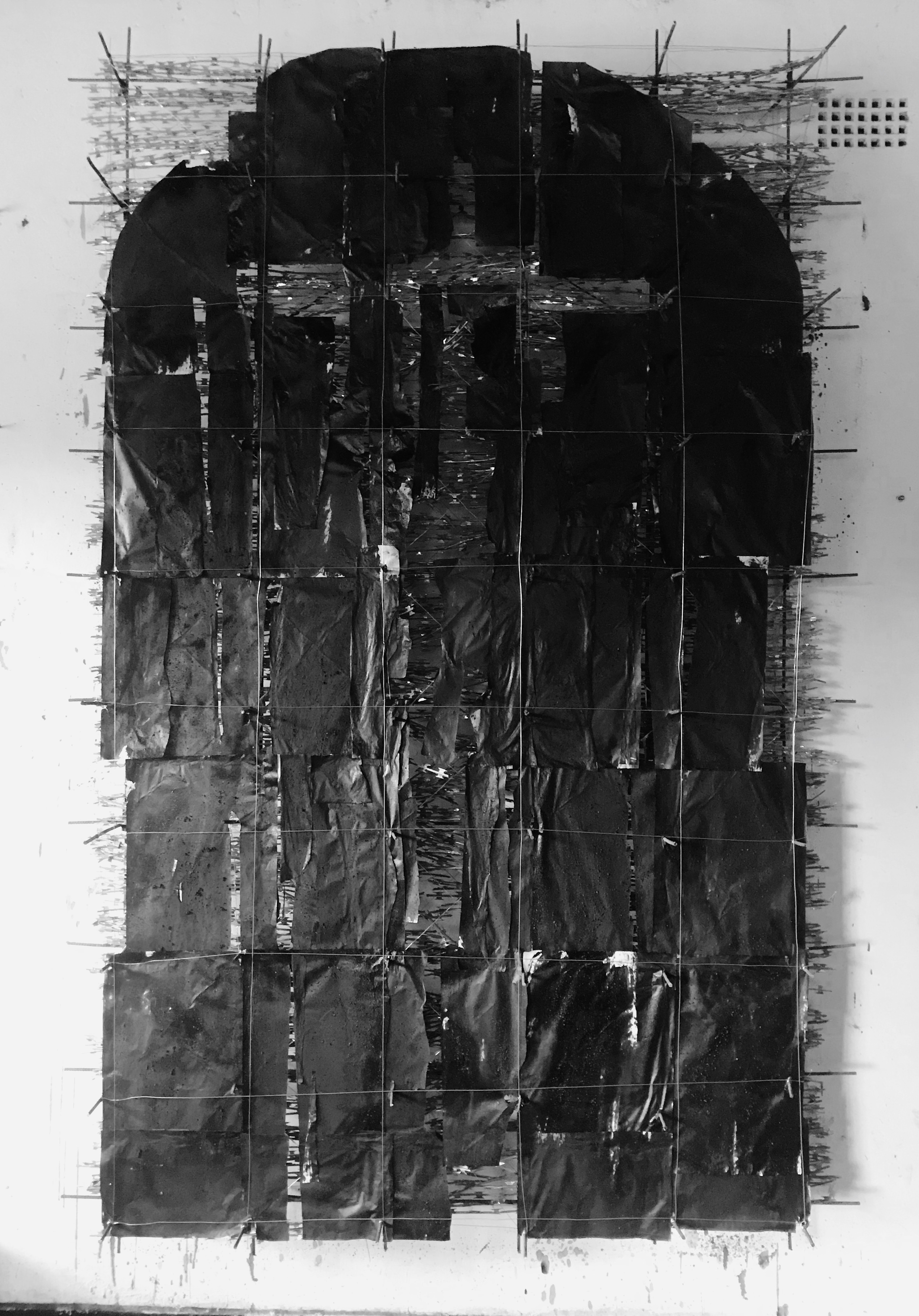 I have worked considerably larger than the Rembrandt painting with the intention to draw the spectator into the work – rather than contemplating the sacrifice from afar. The Christ figure is unseen, and a view of the structures underpinning the darkness is visible. The viewer is challenged to consider the nature of these structures and the nature of the darkness itself and how they may respond in their own context. I have employed the materials that have intrigued me in recent months – those that suggest violence, demarcation, protection, division and control, as well as those that evoke aspects of fragility and temporality.