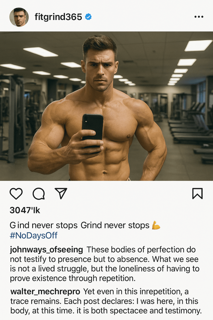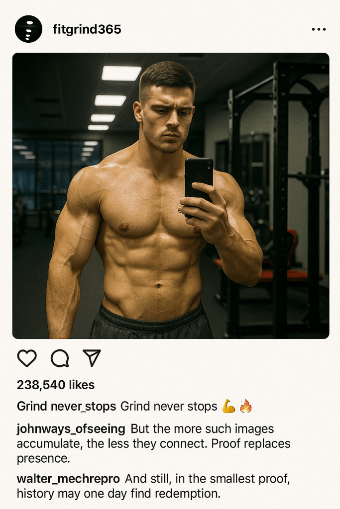 “Perhaps. But still, the noise of circulation is deafening. To be seen has become a compulsion, and absence a kind of shame. The price of visibility is that one is never allowed to vanish. Even solitude must now be posed, posted, performed.”