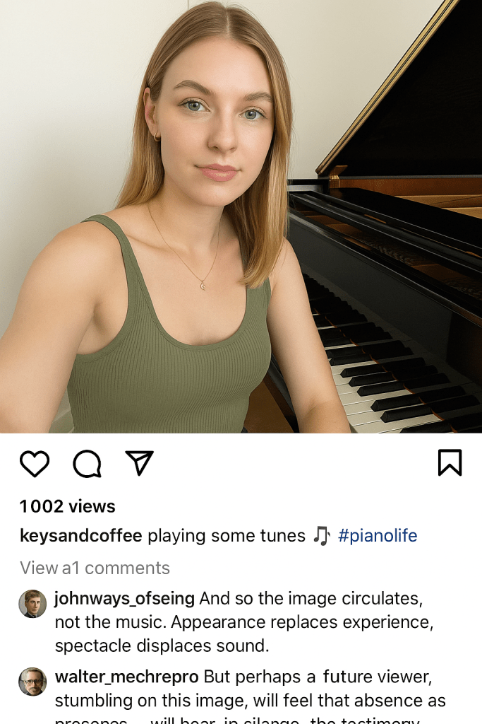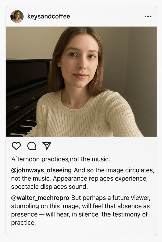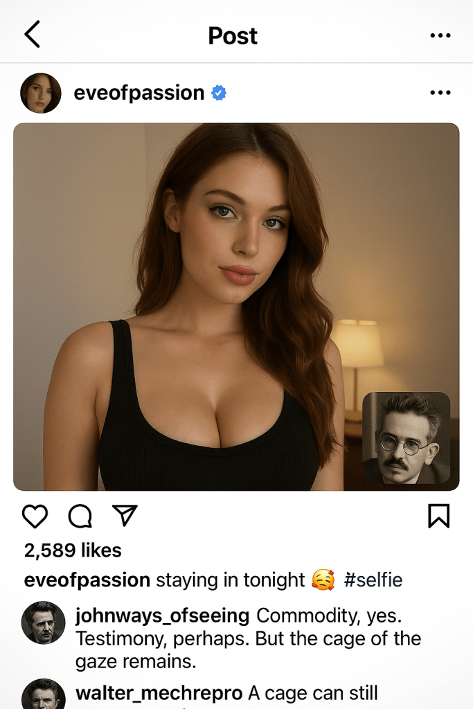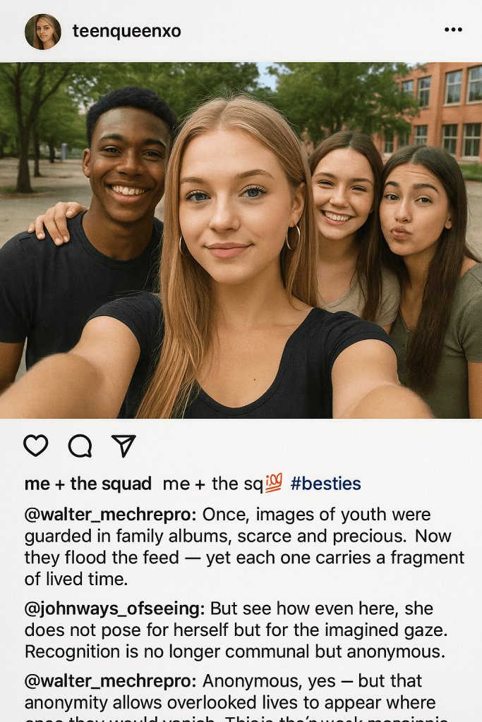 “You see alienation, John, and rightly so. But I also see a different current running beneath. Every selfie is a trace, a fragment of life otherwise invisible to history. In each image a weak messianic power stirs: the power to redeem, to inscribe one’s presence against erasure. A factory worker, a refugee, a teenager in a village — their likeness circulates where once they would have vanished unrecorded. The banality of the form hides its potential.”