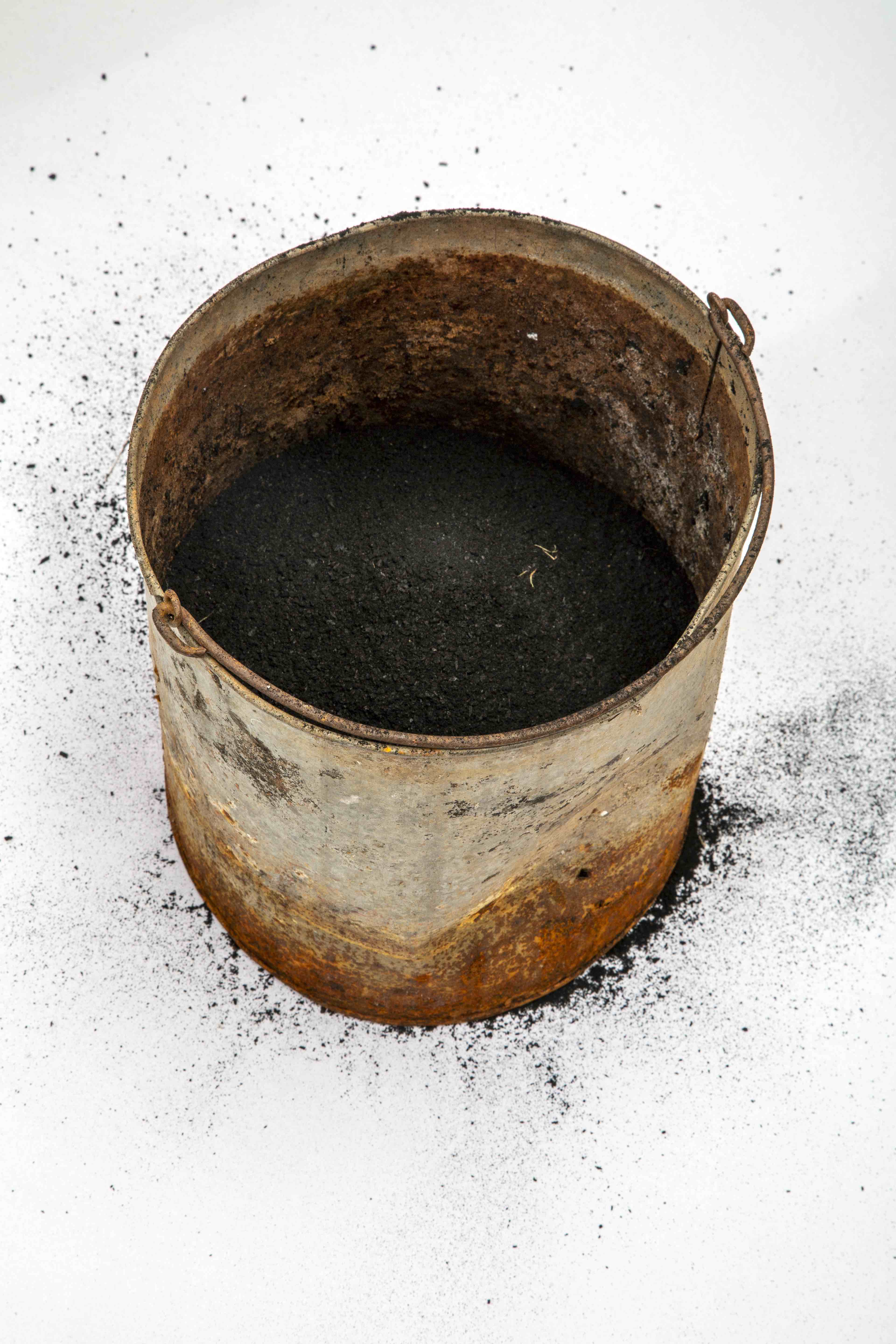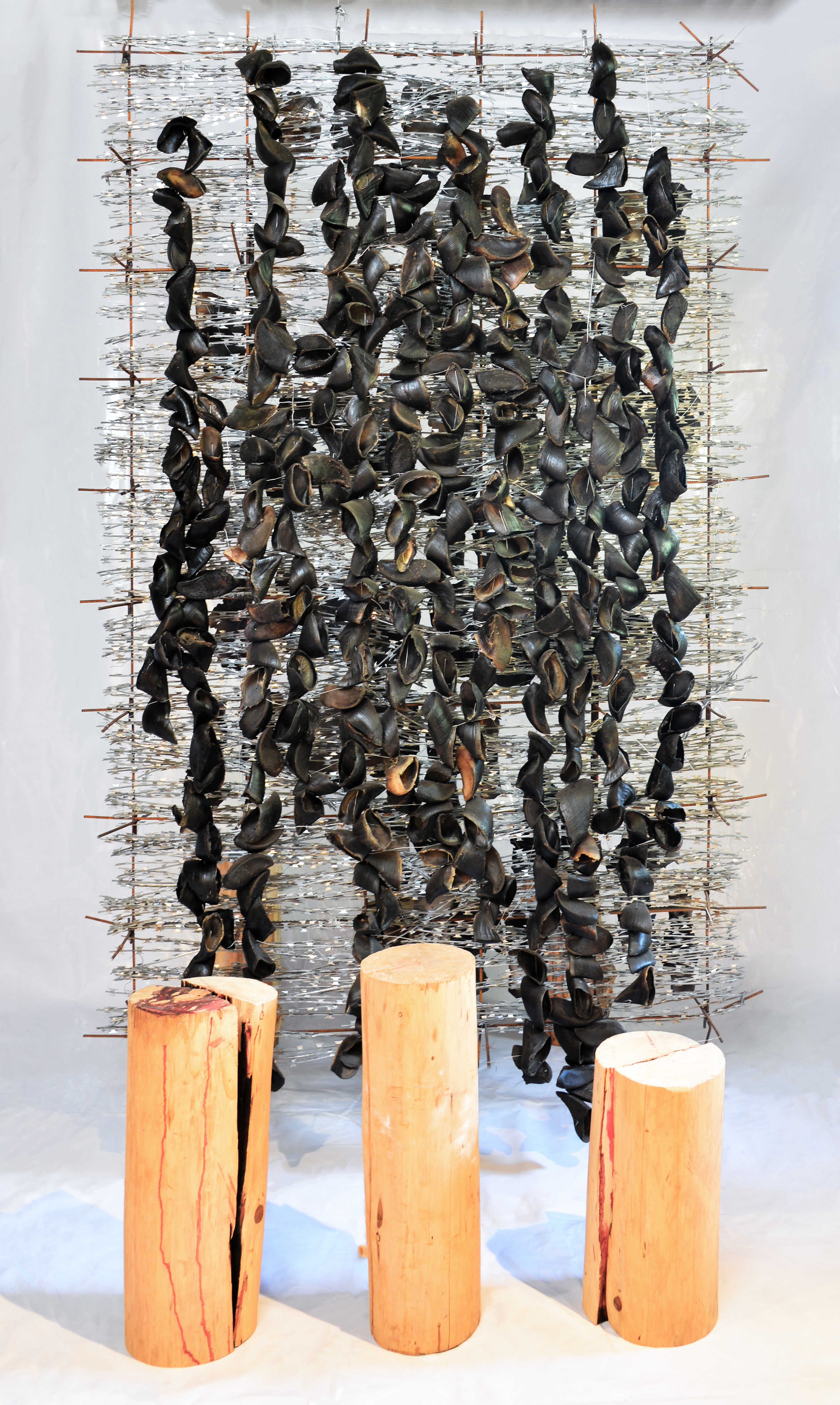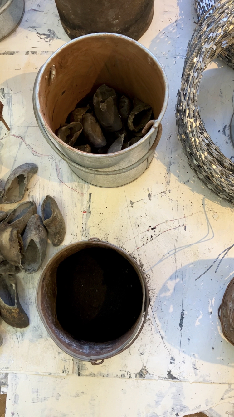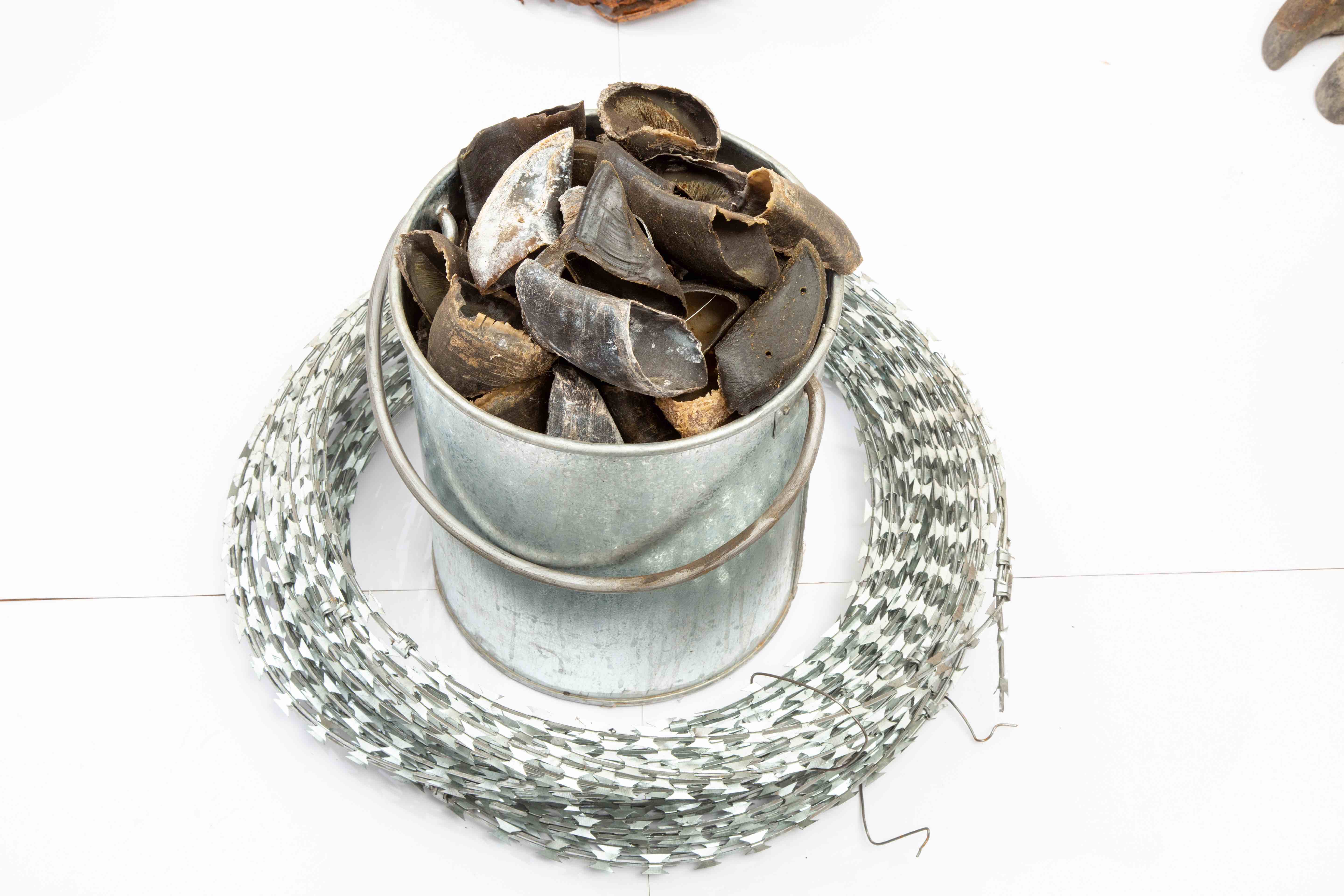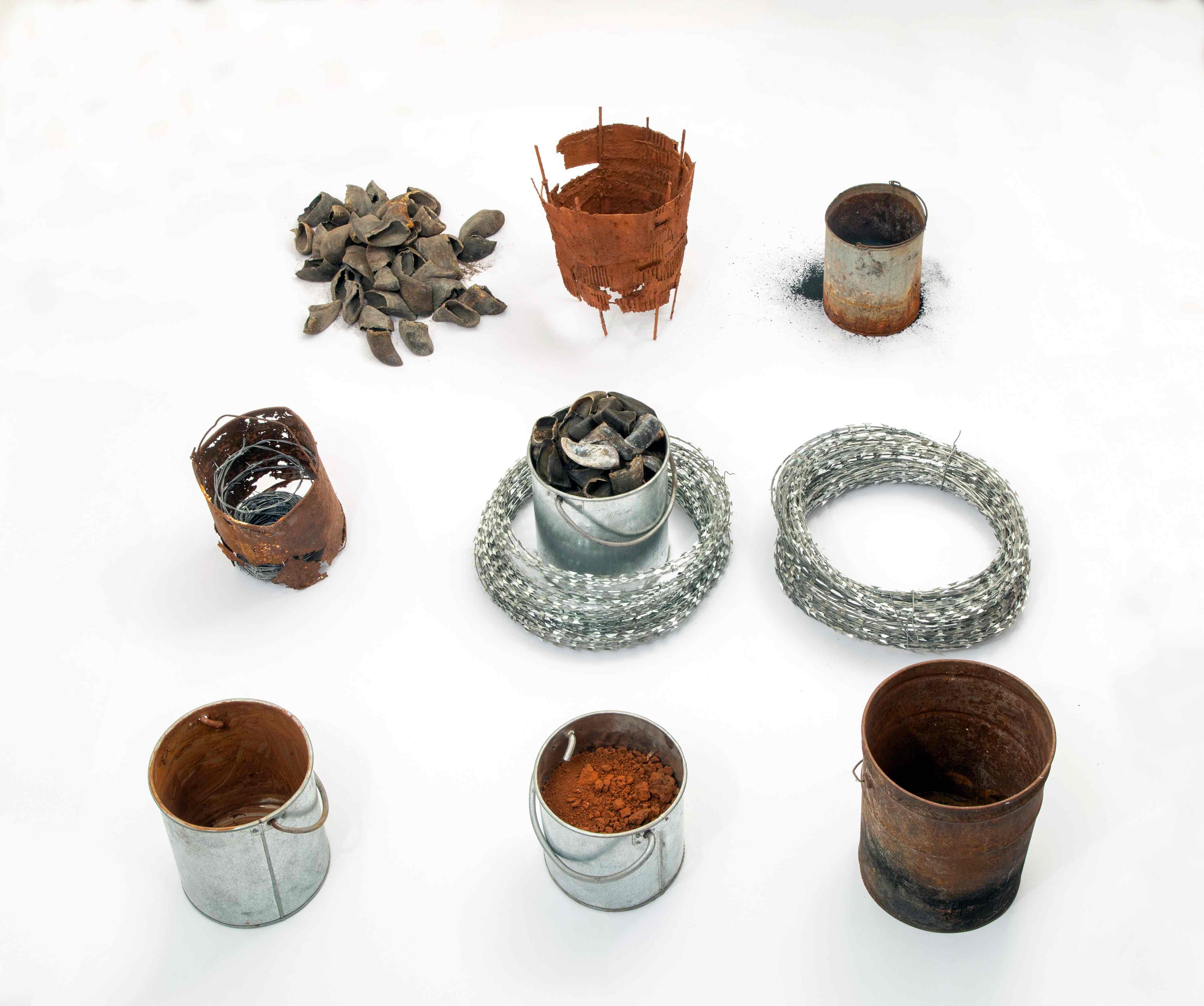 Nine Buckets, Steel, soil, razor wire, barbed wire, cattle hooves, charcoal, wood. Dimensions variable. Texts relating to this work here.