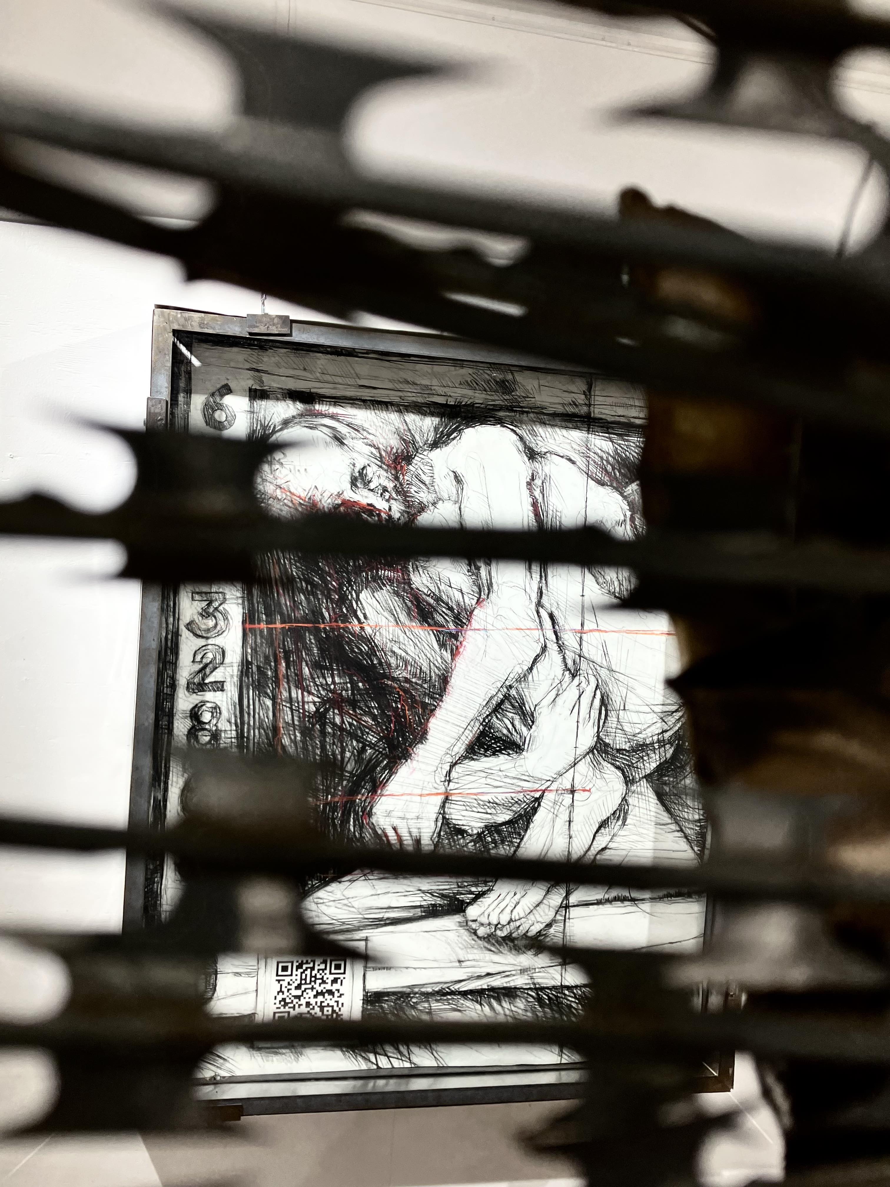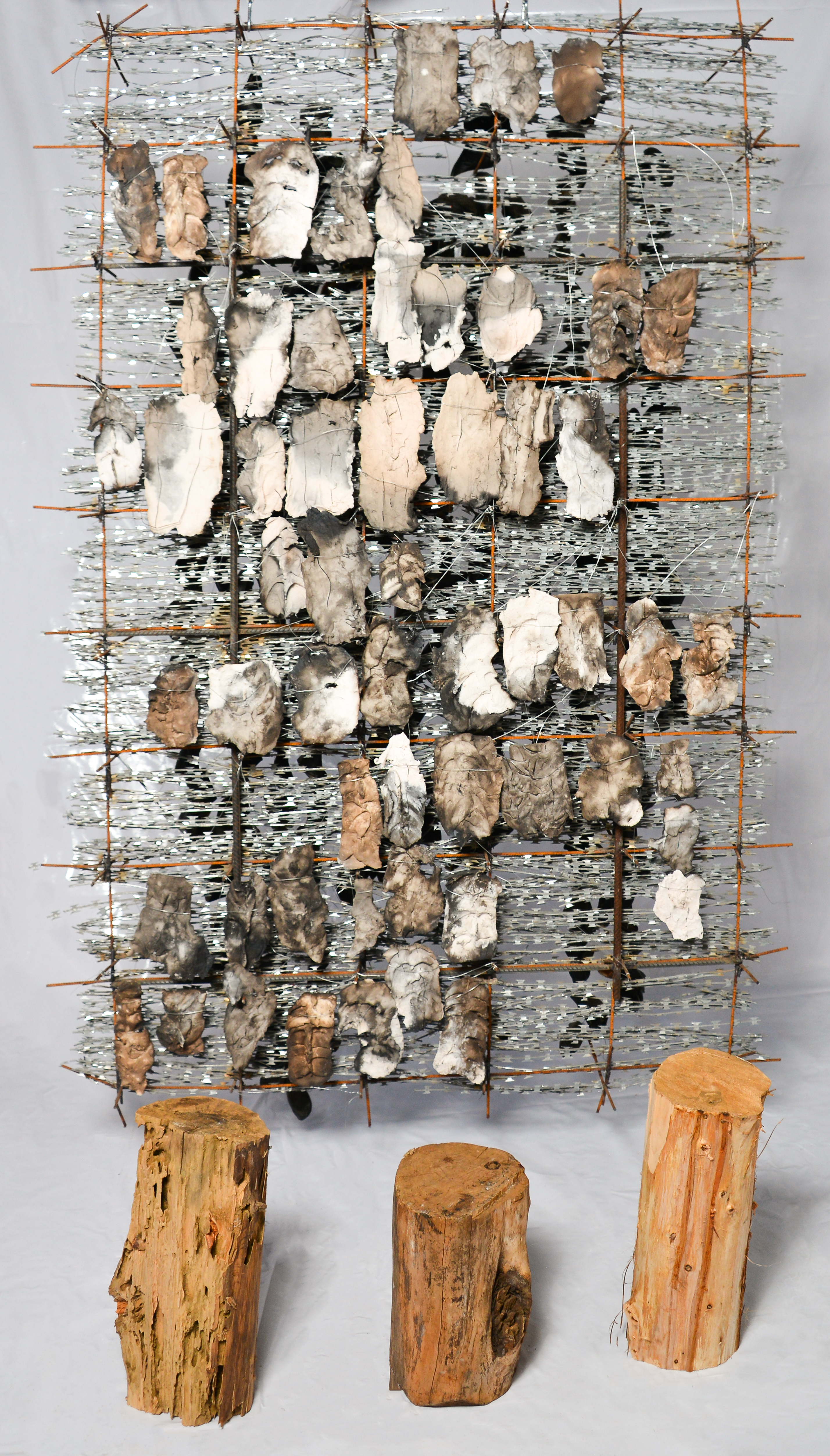 Before the Law (front view), 2021. Cattle hooves, razor wire, wire, wood and clay. 2002 x 275 x 55cm.Before the Law (rear view), 2021. Cattle hooves, razor wire, wire, wood and clay. 2002 x 275 x 55cm.Before the Law, 2022/23. Steel, clay, wood, cattle horn, razor wire, wire and nails. 220 x 55cm. Texts relating to this work here.Before the Law, Installation View.